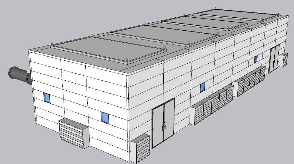 本次項(xiàng)目設(shè)備隔聲罩以鋼結(jié)構(gòu)為骨架,與基礎(chǔ)用螺栓連接;采用框架結(jié)構(gòu),保證結(jié)構(gòu)強(qiáng)度;采用吸隔聲模塊作為壁面主材。隔聲罩總體長(zhǎng)約為20m,寬約為6.7m,高度約為4m??諌簷C(jī)上方以每個(gè)空壓機(jī)的尺寸,每邊空開(kāi)500mm左右做成一個(gè)整體的頂蓋,每個(gè)頂蓋做4個(gè)吊點(diǎn),方便設(shè)備整體吊裝檢修。隔聲罩內(nèi)部留有800mm~1000mm的檢修通道,同時(shí)在隔聲罩上開(kāi)設(shè)觀察窗和照明系統(tǒng),可供人員日常巡查檢修。